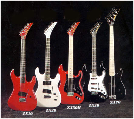 Descriptions: ZX10--one slanted humbucker(Baretta style) and one volume control. Pacer type body design. ZX20--two humbuckers, bridge and neck (Pacer Imperial style), 3 way select, ne volume and one tone. Pacer body style. ZX30--Three single coil pickups in Strat formation on pickguard with five-way select, one volume and two tones. More Strat-ish type body. ZX30H--Same as ZX30 but substituted humbucker in bridge position. Strat-ish type body. ZX70--Modeled after Fender P-bass with single P bass pickup, one volume and one tone. Colors