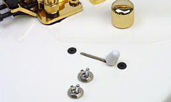 I found a few noteworthy improvements in the JS over the original Kramer RS models. First of all, the 5-way toggle switch is now held in place by two flush mount allen-head screws. The flush mounting of these screws, albeit a small change, really gives a nice clean look to the Jersey Star. Second, the Floyd Rose anchor bolts have been countersunk and secured with inserts. I believe this really gives the Floyd Rose more stability and, long-term, it is less stressful to the guitar body itself. Third, the Pearloid Buttons on the Schaller tuners really provide a nice finishing touch to what I feel is a beautiful guitar design. Finally, the star inlays on the Jersey Star appear to be of much higher quality and craftsmanship than the previous Kramer RS models. Overall, I found it to be a much better constructed guitar than the original Kramer RS models and more true to the artist’s guitar that it represents.
