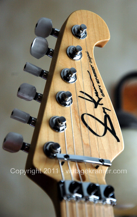 The fretboard and the tuners really stand out as well. These feature birdseye on the board itself, with Gotoh type tuners and pearloid knobs. It is really a nice touch on an already amazing looking instrument. Additionally, the neckplate and tremolo cavity both feature recesses, which not only at to the cosmetics, but makes higher fret access more comfortable that prevents the hand from getting bound up on a bulky neckplate. And one other thing - not to get caught up in silly details, but man I just love the signature Gary Kramer logo on the headstock! |
