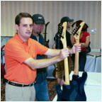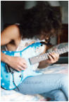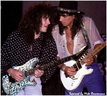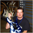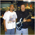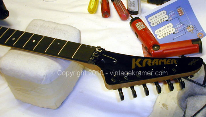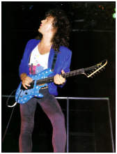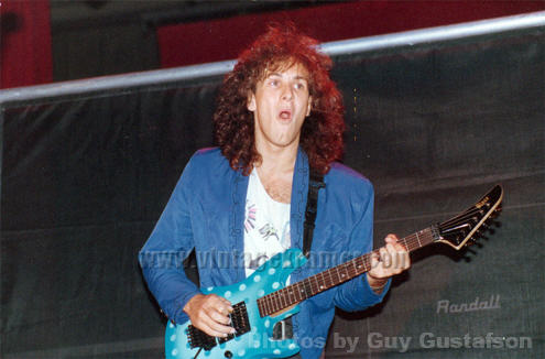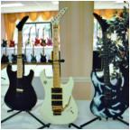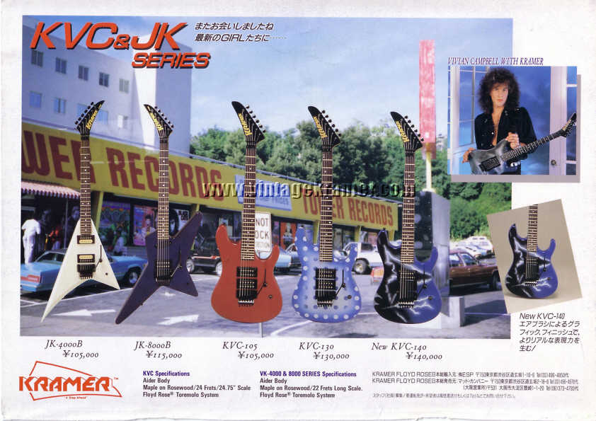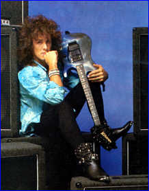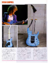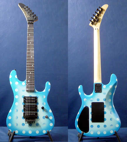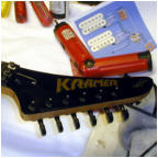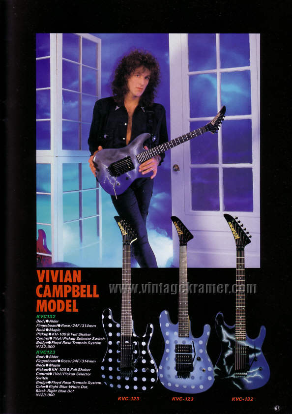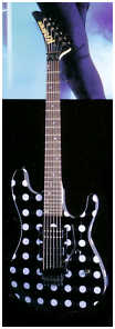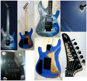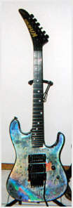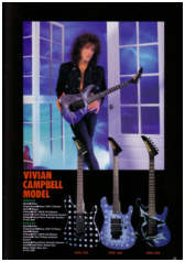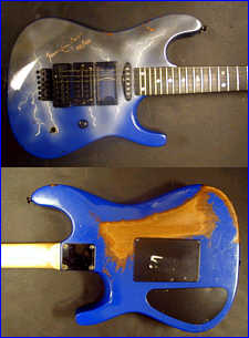 Vivian Campbell is a guitar god to almost every guitar player that is 28 to 45 years old. This is because he was one of the guys who at the beginning of it all really got out there and gave each and every one of us something to shoot at. Vivian's first album with Dio was "Holy Diver" in 1983. The other two that he played on were "Last in Line" in 1984 and "Sacred Heart" in 1985. It is easy to say that I am sure that every one who is reading this, owns those three CD's. If not you must be under 20 years old, and you should go and get them, because that is where a good portion of our music today comes from. After Vivian stopped working with Dio, he filled in for and played along with Adrian Vandenberg (who was always complaining or sick with something) in Whitesnake. Vivian didn't record the record, but played live on the tours. After Vivian's stint with Whitesnake, he started his own band call "River Dogs". I don't know much about them and with out blowing a whole night, I can't find out much about them. Next he became a member of Def Leopard. He was filling for Steve Clark, that had drank himself into the grave (not too bright of an Englishmen). This is the guitar that started it all for every Kramer Nightswan. I believe that the Nightswan to be Kramer's best guitar that they made. That is one of the reason's why you see so many late 80's early 90's pro's using them. Vivian's prototype is actually just that, the first one. It wasn't even made by Kramer. The guitar was made by a Texan named Buddy Blaze. Buddy and Vivian worked together on the guitars design (shape, pick up configuration, woods, etc..). What they came up with is a mahogany body, maple neck with an ebony board. Two hums in the neck and middle position, a volume and a three way, and an original Floyd. The paint job is the legendary lightning graphic (so each lightning graphic you see on ebay, is the son of this guitar - not to mention all the other colors too). I believe that when Vivian (and Buddy) brought the prototype in, Kramer liked it. I believe that they changed the neck so that the neck would say Kramer and not Blaze (like his blue and white polka dot one says) since this was his main photo shoot guitar. This neck is actually not the standard Nightswan neck, it is much narrower and thinner then a normal one. Also there is no truss rod at the top, it is in the heel of the neck. Vivian had used the trem so much, that the holes for the post had become loose in the soft mahogany, so they were plugged with maple and redrilled. Along the way I think there could of been a possible refret and the bridge could of been swapped out for a newer Floyd. This guitar was in Vivian's position from 1987 to 1994 (that is when he gave it back to Buddy). He signed the front when he gave it back. If you look closely in the advertisements, you can see the evolution of the guitar from a two hum, to the one hum with added Tom Anderson single in the neck. Aldo look very closely at the damage to the top of the guitar and how it matches up perfectly. This one truly is one of my most important guitars. This if for two reasons, the history of Kramer and the history of guitar players.