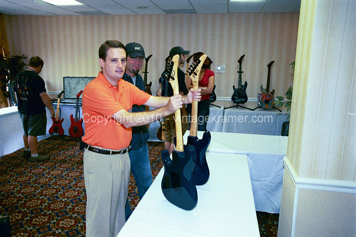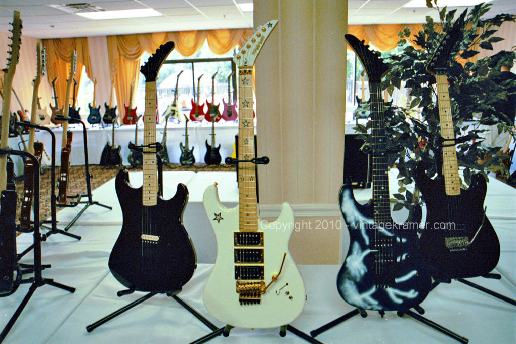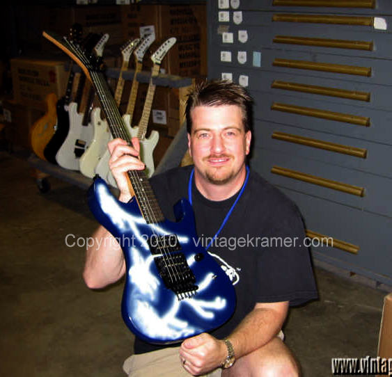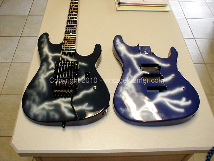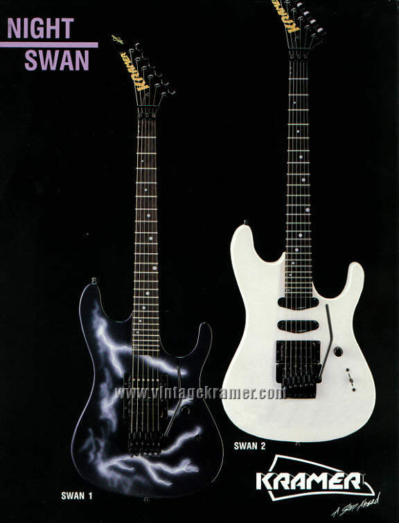 The Nightswan Reissue was a planned attempt at recreating the Lightning Swan that is very popular among Kramer enthusiasts. Richard Akers headed up the original design and engineering on the Swan, using a vintage Kramer Nightswan Lightning as a starting point. At the time, Gibson owned Kramer was attempting to make a line of all USA instruments, which also included the 1985 Baretta Reissue. Additionally, Gibson had just acquired the Baldwin Piano Company out of Arkansas, and the thought was they could make a line of USA guitars through Baldwin, paint and prep there, and then have the USA team in Nashville assemble the instruments. If this idea had worked out, the reissue Swans would have been more Made in USA than the originals. Richard Akers and Michael Maloney worked hard on trying to get this line started. That never came to be. Four bodies were created in the Baldwin factory as prototype runs, from top quality Mohagany. Two necks were connstructed as well, just to see if Baldwin could create the necessary parts for Gibson to assemble these Kramers. Around the time of the 2004 Kramer Konvention, Kramer wanted to have Barettas and Swans available for all the enthusiasts to check out, so Richard spent a large amount of time at Baldwin hand shaping, and fretting the first prototype Nightswan. The four bodies created were airbrushed by Dave MaHaffey. They were rough finished in order to confirm the graphic could be done, they were not showroom quality guitar finishes. The original prototype was shot with nitrocellulose lacquer for the clear coat over the graphic, as were the rest. The final prototype Swan was displayed and played by That 80's Hairband at the 2004 Kramer Konvention and was final assembled by Jimmy Ellis on the USA Kramer team. It still lives in Nashville in the Epiphone plant, and gets attention from time to time from Richard. A second prototype exists that was created from the second neck made at Baldwin, and was most likely assembled by a Kramer employee from parts sold at a Epiphone employee sale. Those two Swan reissues are the only two known in existence at the time of this writing. Two other bodies still exist out there and are probably stored away in someone's garage. Prototype Numbers: