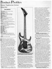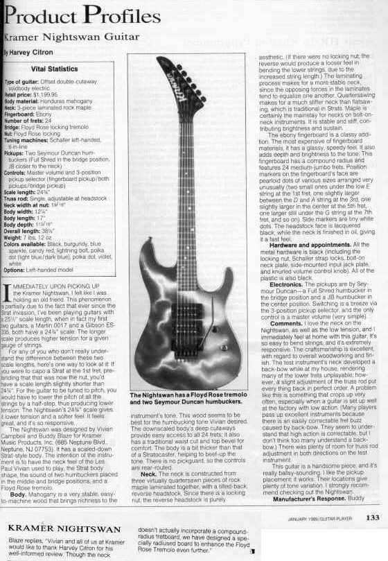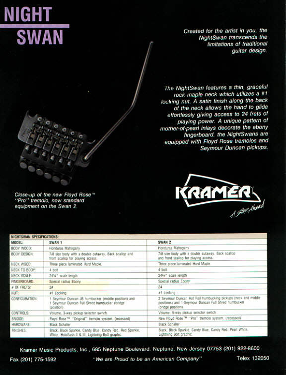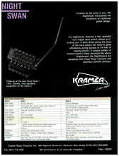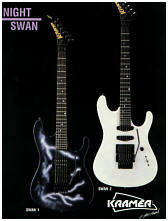 ![]() Kramer Nightswan Features The back shape of the neck is different from any other guitar I've played. Its sort of like a "C" shape, with the middle portion being very flat, and the curves being very sharp. The nut is also an R1, which makes this a very tiny fretboard to play on. Its is a VERY comfortable neck play, its very smooth, and plays like butter. The dot inlays are in a diagonal pattern, which was very original at the time the Nightswan was introduced. I remember hearing that Vivian wanted the neck to have a similar feel to that of a Les Paul, however, I don't think this neck is anywhere close to that description.