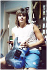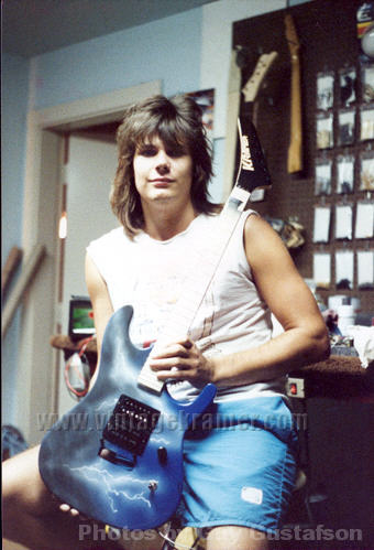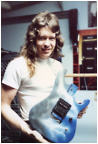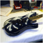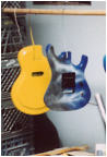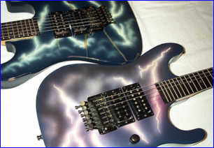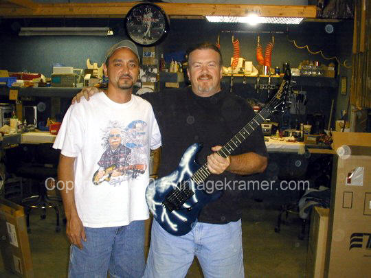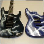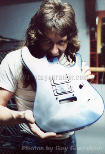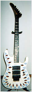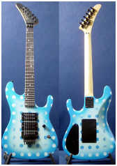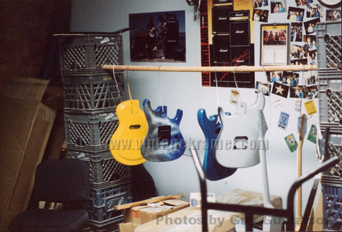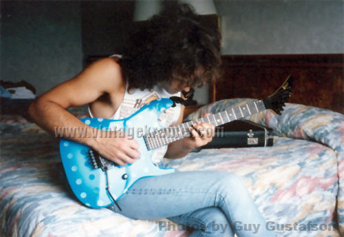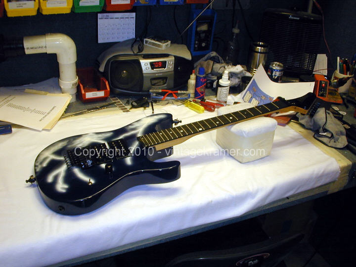 Some other facts about the Shredder/Nightswan/Buddy Blaze that should be noted: 1. Warmoth never made production Swan parts. They made parts for Buddy as "starter" parts for the original Blaze line, but were never able to come up to a deal with Kramer to mass produce Swan parts. All Nightswan parts were made by ESP, just like other American Series Kramers. 2. Vivian and Buddy created the Shredder, it was not a copy of another persons instrument that Buddy had made. Its was truly a collaboration between the two. 3. Buddy retained rights to the Shredder when he went to Kramer, and was to receive royalties based on sales of the Swan as well. 4. The Proaxe was the nail in the coffin to the Nightswan. It is thought the Proaxe possibly was created as a Swan like guitar in order to cut out Vivian and Buddy from sales of the Swan. Given the similarities of the two, it seems a viable scenario for Kramer to do this. 5. Contrary to what many websites say, Buddy did build or paint the Original Dean ML that Darrel "Dimebag" Abbott of Pantera fame owned/played - BUT, the guitar was actually Buddy's personal guitar he made for himself. Upon taking the job with Kramer, Buddy gave the guitar to Darrel as a present to a good friend, as Dime had asked about the guitar repeatidly back then before Buddy moved to New Jersey. The Lightning Prototype Pictures and Details Sometime in 1987, in Arlington, Texas, the Nightswan was born. A VK web visitor, Guy Gustafson, and associate of Buddy Blaze, writes this about the Swan prototypes and Buddy. A very very special thanks goes out to Guy for providing these extremely rare photos of Buddy painting and building the second Swan prototype. The original "Polka Dot" guitar was indeed built from Warmoth parts that were modified. The Nightswan prototype (Lightning Design) was also built from Warmoth parts and built in Texas. Buddy had been in talks with Kramer about the guitar and his job at Kramer during the time he was building the "Lightning" guitar. When he came to an agreement with Kramer, the Kramer logo was added to the guitar before he sent it to Vivian. (see Guy's Photos below). The story on how Buddy got hooked up with Vivian was that Vivian did an in-store appearance at Speir Music in Dallas, Buddy had just finished a guitar for a friend of mine (black and white polka dot) and Vivian was interested in something similiar. He loved it but wanted a second humbucker in the middle position and blue and white dots, along with other various custom changes. As for what happened to Buddy after Kramer. He moved to NYC to start a band. I moved up there in early 1990 to play bass in the band. The band called Gunga Din featured Jesse James Dupree on vocals which he later went on to join Jackel. After a few years of trying to get the band together, he moved to LA. He was a guitar tech for Great White in the late '90s.